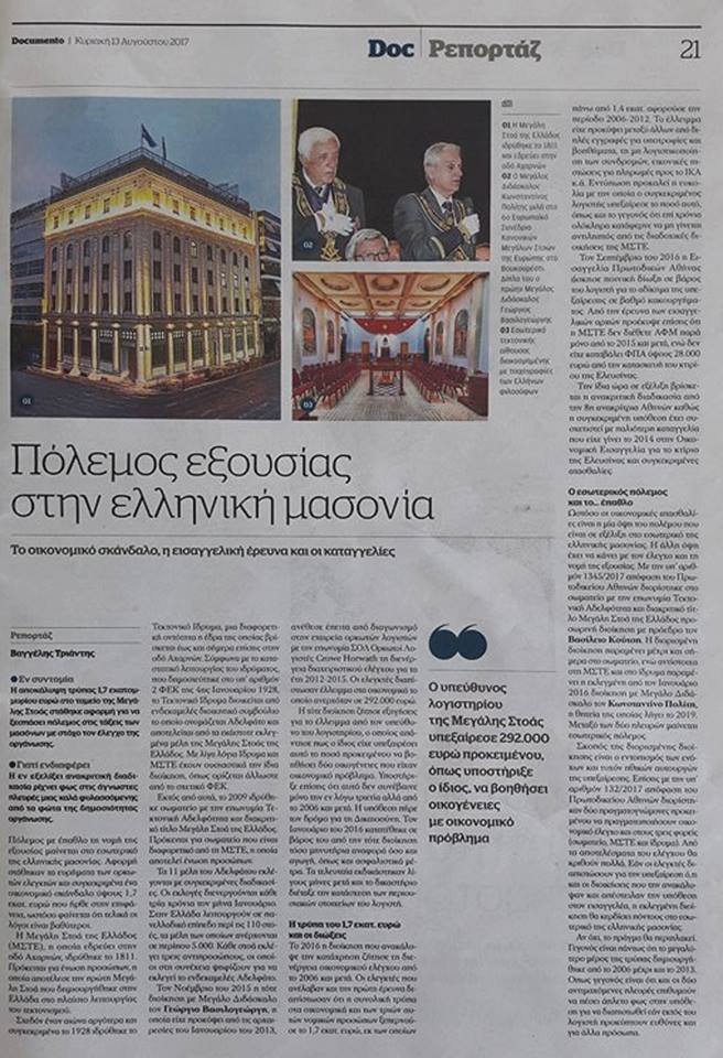 Αποκαλυπτικό ήταν το δημοσίευμα της εφημερίδας DOCUMENTO την Κυριακή υπό τον τίτλο: “Πόλεμος εξουσίας στην ελληνική μασονία”.