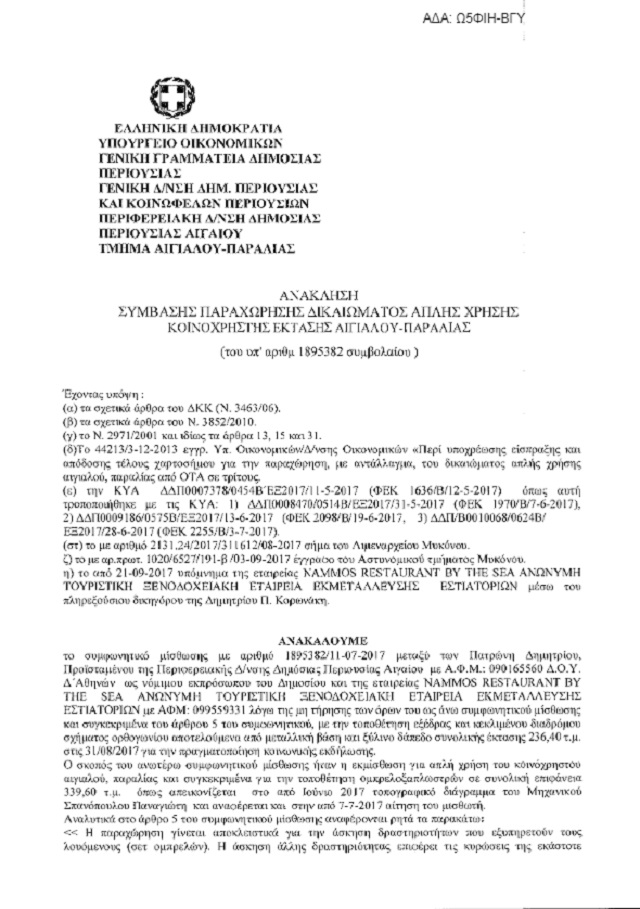 Συγκεκριμένα, ανακλήθηκε το από 11/7/2017 συμφωνητικό μίσθωσης μεταξύ της Περιφερειακής Διεύθυνσης Δημόσιας Περιουσίας Αιγαίου και της εταιρείας NAMMOS RESTAURANT BY THE SEA «λόγω της μη τήρησης των όρων» του συμφωνητικού μίσθωσης «με την τοποθέτηση εξέδρας και κεκλιμένου διαδρόμου σχήματος ορθογωνίου αποτελούμενα από μεταλλική βάση και ξύλινο δάπεδο συνολικής έκτασης 236,40 τμ στις 31/8/2017 για την πραγματοποίηση κοινωνικής εκδήλωσης».