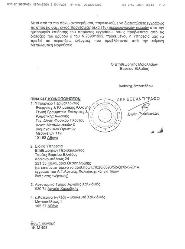 Σύμφωνα με την Επιθεώρηση Μεταλλείων (1634/04-06-2014) οι εργασίες διάνοιξης δρόμου στο Λάκκο Καρατζά από την Ελληνικός Χρυσός στις Σκουριές δε διαθέτουν άδεια, είναι παράνομες και πρέπει να σταματήσουν άμεσα.