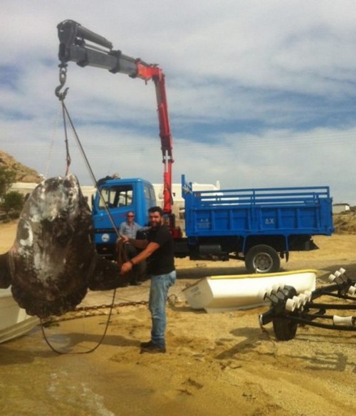 Όπως βλέπετε στις εικόνες, το ψάρι βάρους 250 κιλών μεταφέρθηκε με γερανό, ενώ στην συνέχεια τοποθετήθηκε σε αγροτικό όχημα.