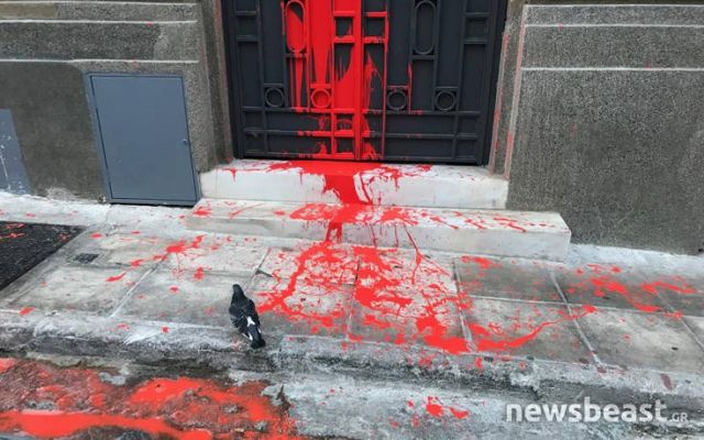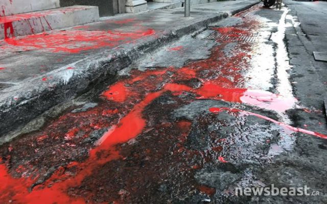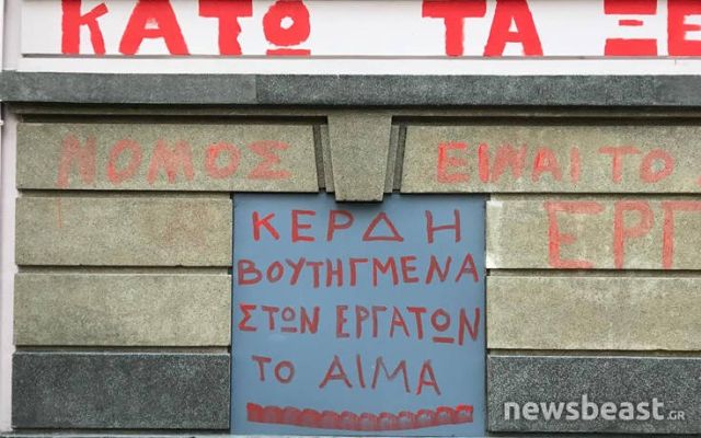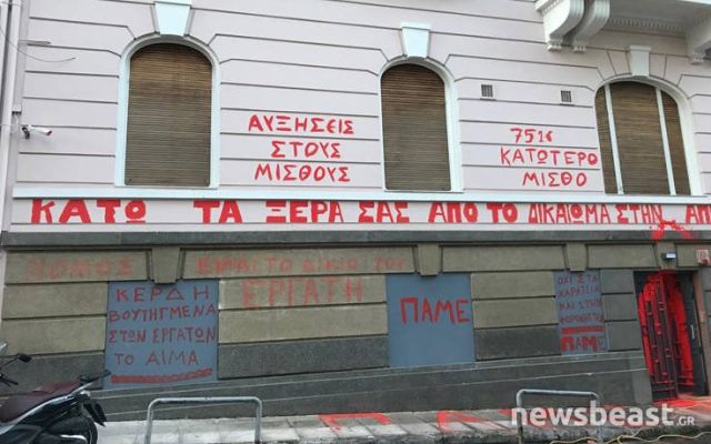 Τα μέλη του ΠΑΜΕ έγραψαν με κόκκινη μπογιά, στο κτίριο που στεγάζεται ο ΣΕΒ, συνθήματα για κατώτατο μισθό στα 751 ευρώ και ενάντια στην όποια παρέμβαση στο απεργιακό δικαίωμα.