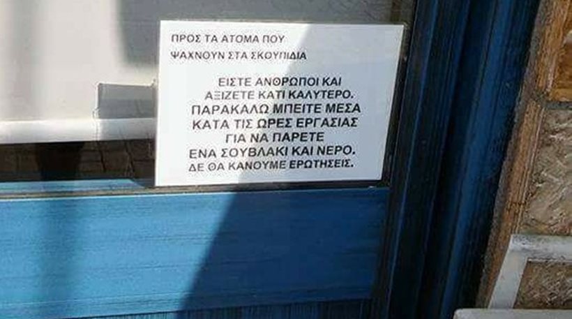 «Προς τα άτομα που ψάχνουν στα σκουπίδια. Είστε άνθρωποι και αξίζετε κάτι καλύτερο. Παρακαλώ μπείτε μέσα κατά τις ώρες εργασίας για να πάρετε ένα σουβλάκι και νερό. Δεν θα κάνουμε ερωτήσεις».