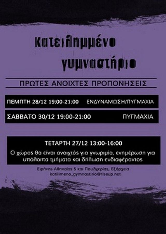 Το πρώτο αυτοδιαχειριζόμενο γυμναστήριο είναι γεγονός, καθώς μια ομάδα αντιεξουσιαστών πραγματοποίησε κατάληψη σε γυμναστήριο στα Εξάρχεια και ξεκινά άμεσα προπονήσεις πυγμαχίας.