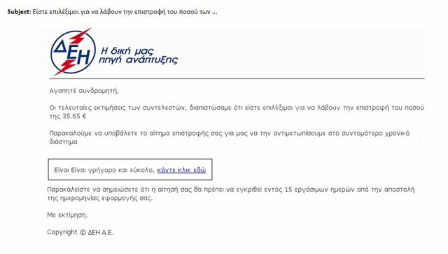 Με παραπλανητικά μηνύματα ηλεκτρονικού ταχυδρομείου για δήθεν επιστροφή χρημάτων από την ΔΕΗ, προσπαθούσαν επιτήδειοι να εξαπατήσουν ανυποψίαστους πολίτες.