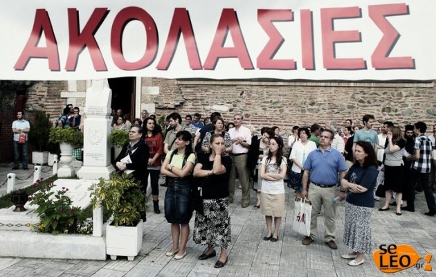 Στο προαύλιο της εκκλησίας του Αγίου Δημητρίου συγκεντρώθηκαν δεκάδες χριστιανοί που διαμαρτύρονται για τη διοργάνωση του Gay Pride στην Θεσσαλονίκη.