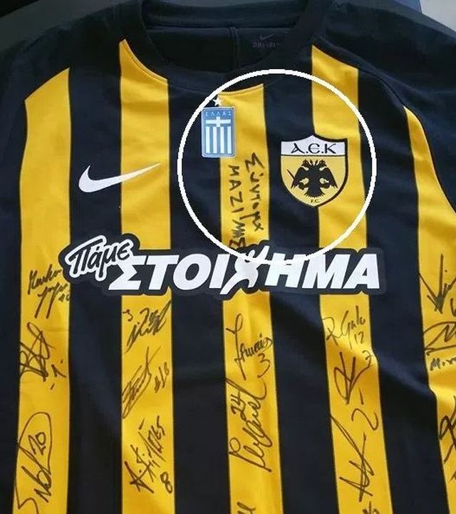 Στη φανέλα που έστειλαν οι άνθρωποι της ΑΕΚ υπάρχει η φράση «Σύντομα ΜΑΖΙ ΜΑΣ» ανάμεσα στην ελληνική σημαία και το σήμα της ΑΕΚ.