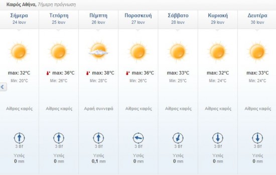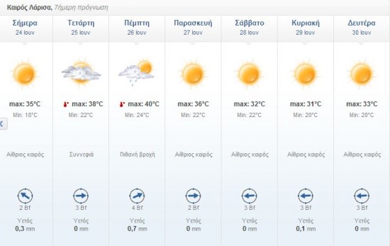 Σύμφωνα με τους αναλυτικούς πίνακες του freemeteo μπορείτε να δείτε ότι στην Αθήνα το θερμόμετρο θα δείξει 38 βαθμούς, στην Λάρισα 40 και στο Άργος 41 βαθμούς κελσίου.