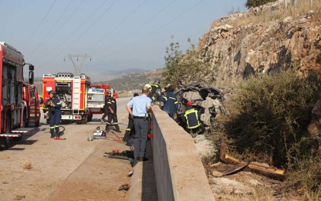 Το αυτοκίνητο είναι μια άμορφη μάζα με την Πυροσβεστική Υπηρεσία να προσπαθεί να απεγκλωβίσει τους άτυχους επιβάτες μέσα από το όχημα.