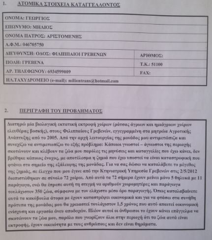 Σύμφωνα με το site greveniotis.gr κάνει έκκληση να παρέμβουν οι αρμόδιοι και δηλώνει αποφασισμένος να συνεχίσει την απεργία πείνας μέχρις ότου ενδιαφερθούν για την καταστροφή που έχει υποστεί η βιολογική μονάδα εκτατικής εκτροφής χοίρων (άγριων και ημιάγριων χοίρων ελευθέρας βοσκής) στους Φιλιππαίους Γρεβενών από τις αλεπάλληλες κλοπές ζώων που έχει υποστεί.