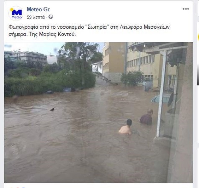Σε ποτάμι μετατράπηκε ο δρόμος έξω από το νοσοκομείο Σωτηρία, με ανθρώπους να κολυμπούν ουσιαστικά μέσα στα νερά.