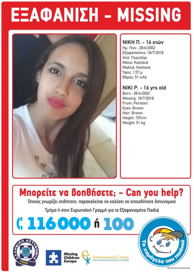 Επί ποδός βρίσκονται οι Αρχές για την εξαφάνιση της 16χρονης Νίκης από το Περιστέρι.