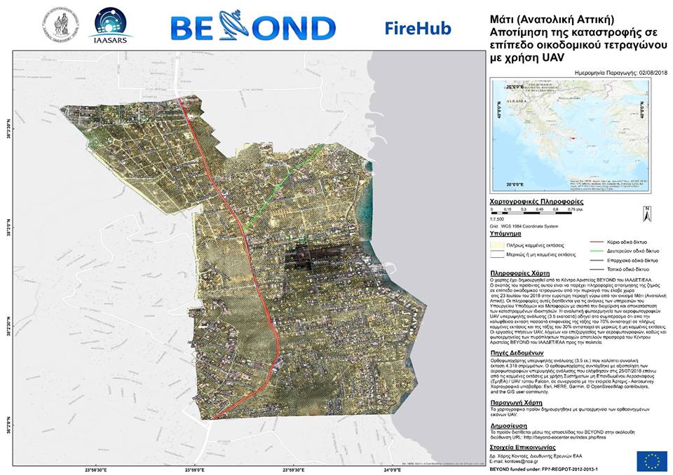 Πιο συγκεκριμένα, το Κέντρο Διαχείρισης Φυσικών Καταστροφών BEYOND του Ινστιτούτου Αστρονομίας, Αστροφυσικής, Διαστημικών Εφαρμογών & Τηλεπισκόπησης (ΙΑΑΔΕΤ) του Εθνικού Αστεροσκοπείου Αθηνών (ΕΑΑ) δημοσιεύει σήμερα χάρτη με λεπτομερή αποτίμηση της καταστροφής σε επίπεδο οικοδομικού τετραγώνου στον οικισμό Μάτι (Ανατολική Αττική) με συστήματα Drones/UAV υπερυψηλής χωρικής ανάλυσης (3,5 εκατοστά).