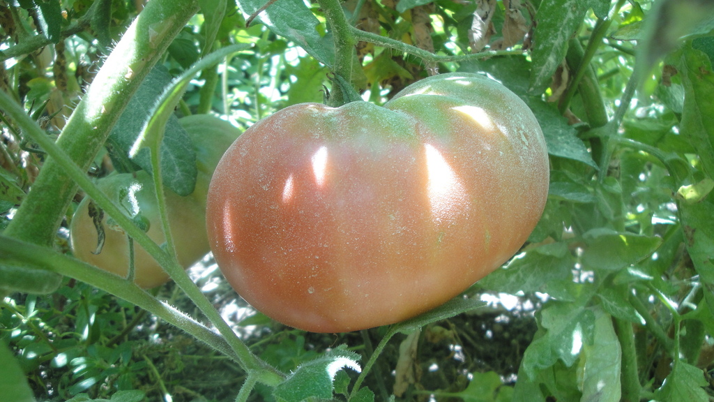 Η πρώτη ώριμη ντομάτα που έκοψε ζυγίζει 496 γραμμάρια και οι υπόλοιπες, που είναι περίπου του ιδίου μεγέθους, μέχρι να ωριμάσουν ίσως γίνουν ακόμα μεγαλύτερες…