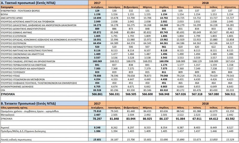 Ειδικότερα, τα στοιχεία της «Απογραφής» καταγράφουν το ανθρώπινο δυναμικό του ελληνικού Δημοσίου στους 566.511 υπαλλήλους κατά τον μήνα Αύγουστο – μέχρι τον οποίο είναι επικαιροποιημένα τα στοιχεία, σε αντίθεση με τους στους 566.948 εργαζόμενους μόνιμους εργαζόμενους (εκτός ΝΠΙΔ), που μετρούσε η καταγραφή του Απριλίου.