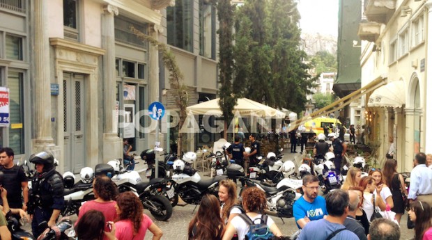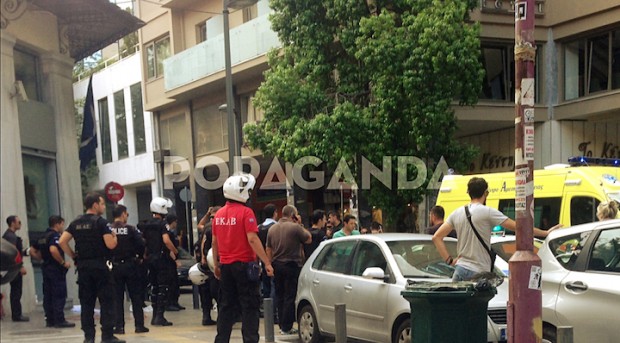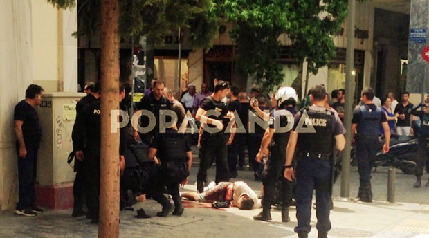 Δίπλα του χτυπημένος ένας αστυνομικός. Αρχίζει και επικρατεί ένα χάος με δεκάδες αστυνομικούς και σειρήνες από περιπολικά. Πλησιάζω στα πέντε μέτρα και τραβάω μερικές φωτογραφίες με το κινητό. Ο αιμόφυρτος άνδρας μοιάζει νεκρός.