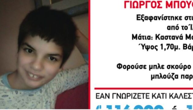Αργά το βράδυ της Τρίτης βρέθηκε ο Γιώργος Μπούφας 12 ετών, ο οποίος είχε εξαφανιστεί μεσημβρινές ώρες της ίδιας ημέρας από την περιοχή του Ιλίου Αττικής και είναι καλά στην υγεία του.