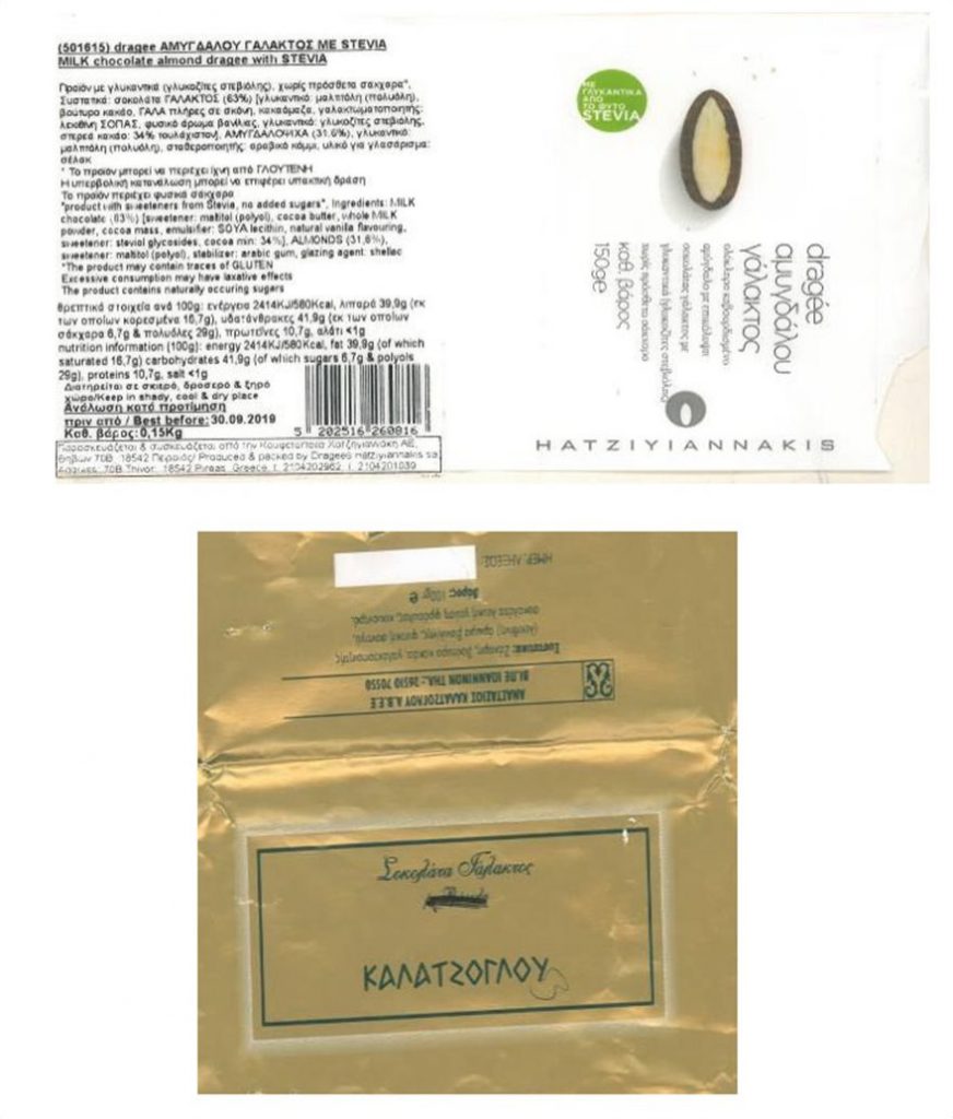 1. Το προϊόν σοκολάτας γάλακτος με αμύγδαλα με την εμπορική ονομασία dragée αμυγδάλου γάλακτος, σε συσκευασία των 150 γρ. με ημερομηνία λήξης 30/9/2019, το οποίο παρασκευάζεται από την εταιρεία ΧΑΤΖΗΓΙΑΝΝΑΚΗ ΚΟΥΦΕΤΟΠΟΙΙΑ ΑΕ με έδρα στην οδό Θηβών 70Β, Πειραιάς.