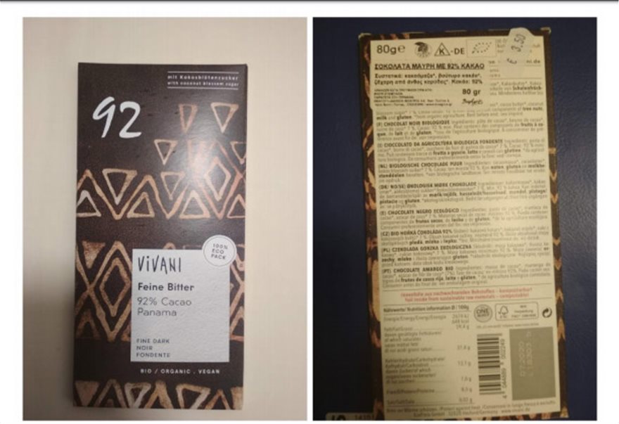 3. Το προϊόν σοκολάτας μαύρης με 92% κακάο με την εμπορική ονομασία VIVANI, σε συσκευασία των 80 γρ. αριθμ. παρτίδας L 18303 και ημερομηνία λήξης 7-2020, το οποίο εισάγεται από τη Γερμανία από την εταιρεία ΒΙΟΑΓΡΟΣ ΑΕ, Βασιλέως Παύλου 2, Κρύα Βρύση Πέλλας.