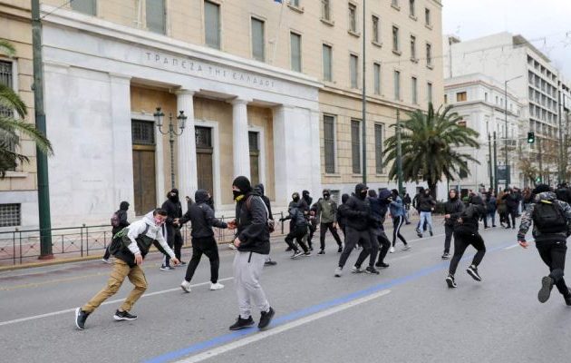 Άτομα με καλυμμένα τα χαρακτηριστικά τους πέταξαν αντικείμενα προς τους αστυνομικούς και έσπασαν στάσεις λεωφορείων και την πρόσοψη και ATM τράπεζας.