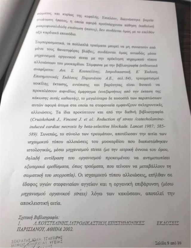 »Οι ισχαιμικού τύπου αλλοιώσεις, επήλθαν σε έδαφος υγιών στεφανιαίων αγγείων και η οργανική επιβάρυνση (μέσω μηχανισμού οργανικού stress) λόγω των κακώσεων, αποτελεί την αποκλειστική αιτία».