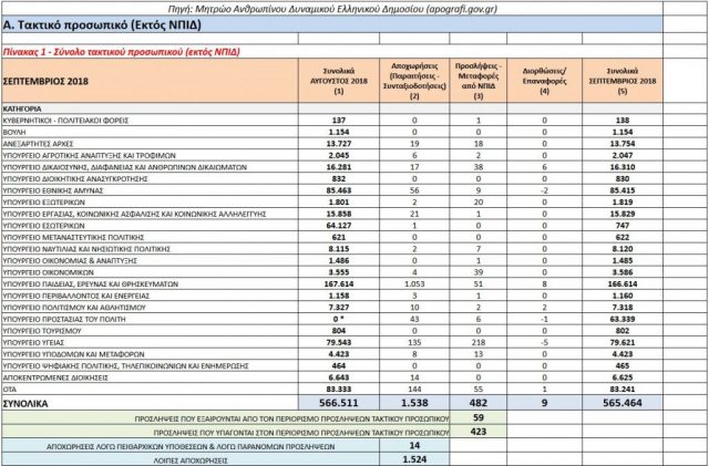 Ειδικότερα, τα στοιχεία της «Απογραφής» καταγράφουν το ανθρώπινο δυναμικό του ελληνικού Δημοσίου στους 565.464 μόνιμους υπαλλήλους τον Σεπτέμβριο -μέχρι τον οποίο είναι επικαιροποιημένα τα στοιχεία- αριθμός που είναι μειωμένος κατά 1.047 εργαζόμενους συγκριτικά με τον Αύγουστο, οπότε ανήλθαν σε 566.551.