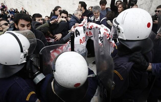 Δυνάμεις της αστυνομίας απώθησαν τους διαδηλωτές, προκειμένου να μην μπουν στο προαύλιο της Βουλής.