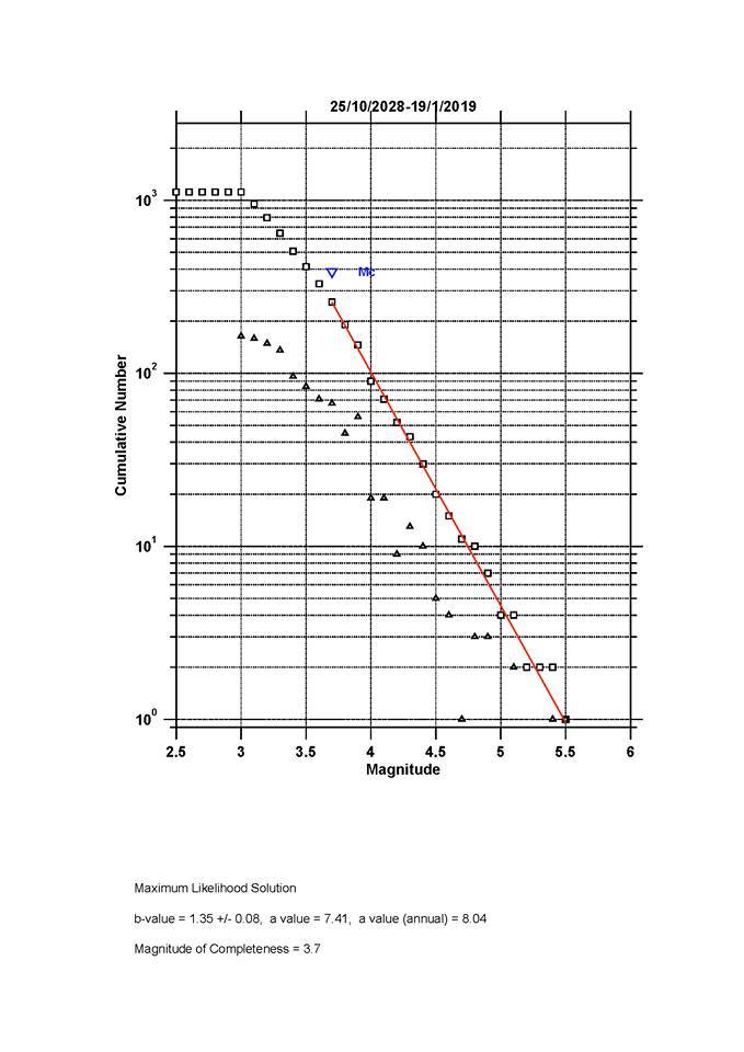 Παράλληλα, σημειώνει πως παρατηρείται φθίνουσα πορεία τόσο ως προς το μέγεθος όσο και ως προς τον αριθμό των σεισμών, παραθέτοντας και σχετικά σχεδιαγράμματα.