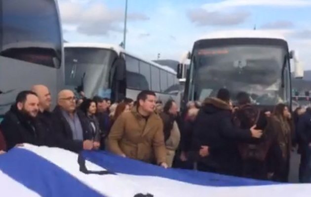 Οι διαδηλωτές τραγουδούν το «Μακεδονία ξακουστή» ενώ περιμένουν τη μεταφορά τους που μέχρι στιγμής γίνεται χωρίς προβλήματα.