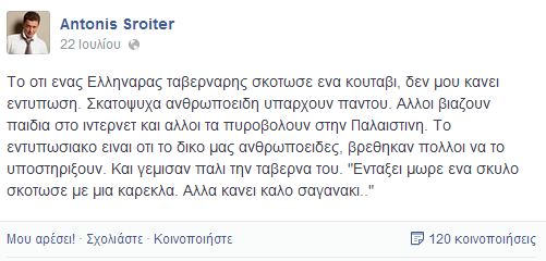 Φανερά οργισμένος ο Αντώνης Σρόιτερ έγραψε στο facebook ότι “Σκατόψυχα ανθρωποειδή υπάρχουν παντού. Άλλοι βιάζουν παιδιά στο ίντερνετ και άλλοι τα πυροβολούν στην Παλαιστίνη. Το εντυπωσιακό είναι ότι το δικό μας ανθρωποειδές, βρέθηκαν πολλοί να το υποστηρίξουν”.