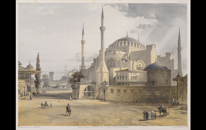Ένα αντίτυπο του «Aya Sofia, Constantinople» (Λονδίνο 1852), με 25 λιθογραφίες χαραγμένες σε σχέδια του αρχιτέκτονα G. Fossati, που οργάνωσε τις εργασίες αποκατάστασης του μνημείου των ετών 1847-1849.