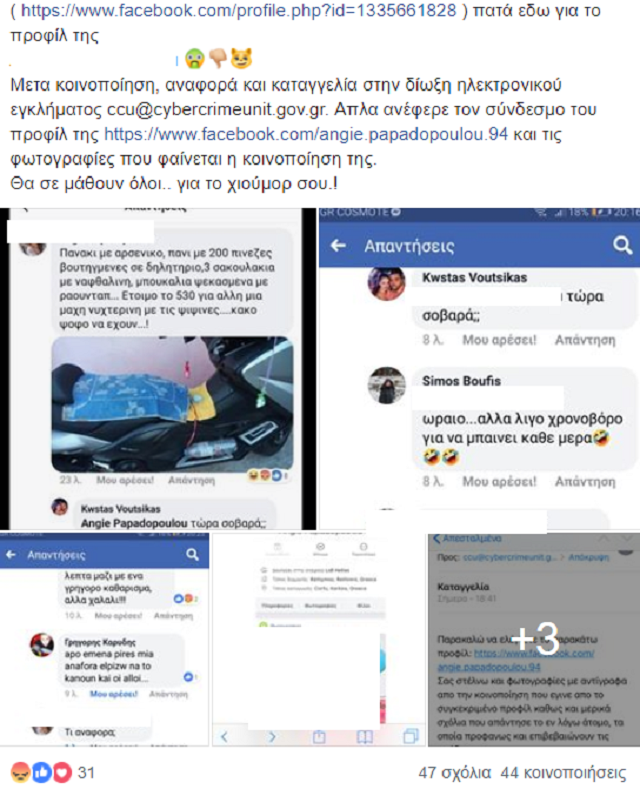 Η ανάρτησή της, ξεσήκωσε άμεσα κύμα διαδικτυακής οργής με εκατοντάδες σχόλια, αναφορές και πολλές καταγγελίες στην δίωξη ηλεκτρονικού εγκλήματος.