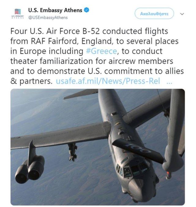 Τέσσερα στρατηγικά βομβαρδιστικά B-52 των ΗΠΑ απογειώθηκαν τη Δευτέρα από τη βάση της βρετανικής RAF και πέταξαν προς διάφορες κατευθύνσεις στην Ευρώπη, μεταξύ των οποίων η θάλασσα της Νορβηγίας, η Βαλτική (στην Εσθονία) και η Ελλάδα στη Μεσόγειο, αναφέρει σχετική ανακοίνωση της Αμερικανικής Αεροπορίας και ανάρτηση της πρεσβείας της χώρας.