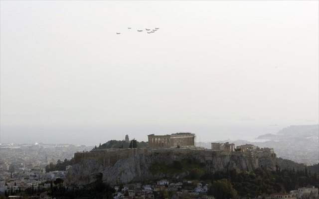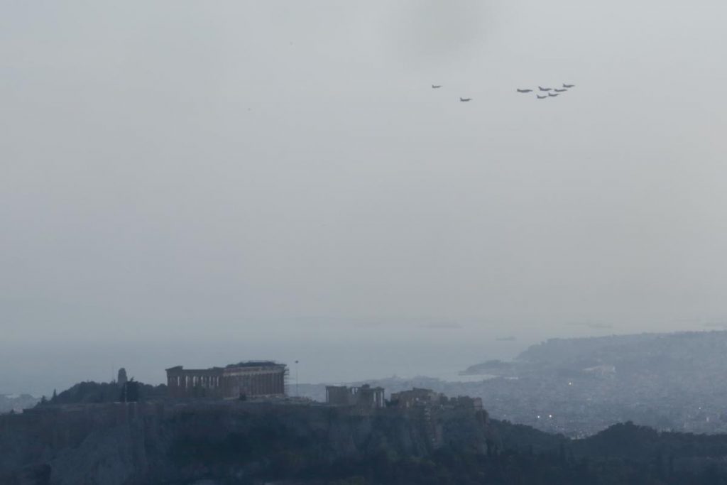 Από τις 18.20 έως τις 18.30, όσοι Αθηναίοι έστρεψαν το βλέμμα ψηλά είδαν το σπάνιο θέαμα ενός σχηματισμού μαχητικών αεροσκαφών.