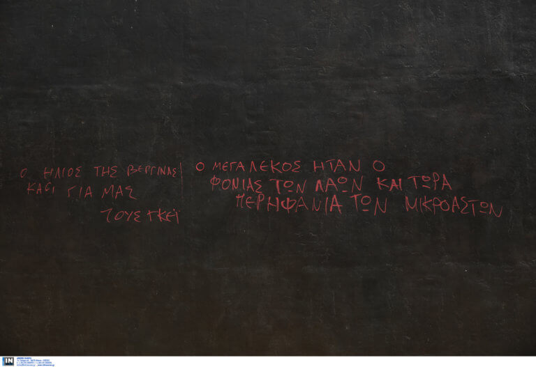 Άγνωστοι έγραψαν με κόκκινη μπογιά στη βάση του αγάλματος δύο «μηνύματα», θεωρώντας προφανώς πως με αυτόν τον τρόπο κάνουν κάποια εξυπνάδα, ή περνούν κάποιο ταξικό ή κοινωνικό-πολιτικό μήνυμα.