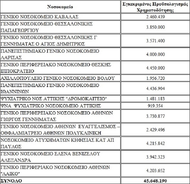 Επί του συγκεκριμένου, η χρηματοδότηση καλύπτει ποσοστό 100% και αφορά στην υλοποίηση παρεμβάσεων στις κατηγορίες i) Ενεργειακή Aναβάθμιση και Εξοικονόμηση Ενέργειας (ΕΞΕ) ii) Εγκατάσταση Μονάδων Συμπαραγωγής Ηλεκτρισμού – Θερμότητας (ΣΗΘΥΑ) και Αξιοποίηση Ανανεώσιμων Πηγών Ενέργειας (ΑΠΕ) και iii) Αντικατάσταση Ιατροτεχνολογικού Εξοπλισμού.