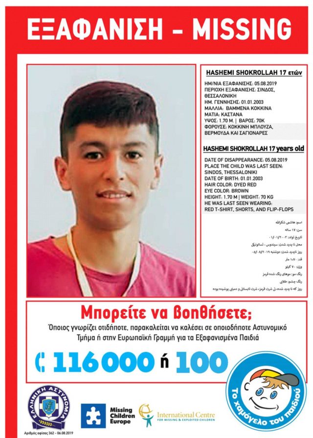 Συγκεκριμένα εξαφανίστηκε από την Σίνδο Θεσσαλονίκης, ο Hashemi Shokrollah, 17 χρονών, αφγανικής καταγωγής.