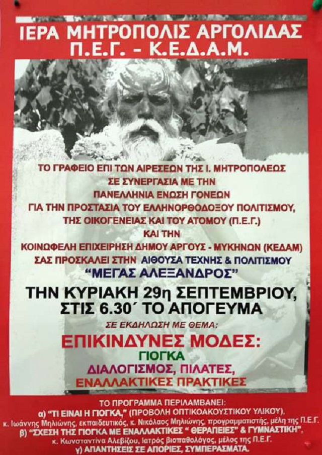 Σε ανακοίνωση της, η Ιερά Μητρόπολη Αργολίδος –και πιο συγκεκριμένα το γραφείο επί των αιρέσεων– σε συνεργασία μάλιστα με την «Πανελλήνια Ένωση Γονέων για την προστασία του ελληνορθόδοξου πολιτισμού, της οικογένειας και του ατόμου» και την κοινωφελή επιχείρηση του Δήμου Άργους – Μυκήνων (!), ενημερώνουν ότι διοργανώνουν εκδήλωση για τις «επικίνδυνες μόδες: γιόγκα, διαλογισμός, πιλάτες και εναλλακτικές πρακτικές».