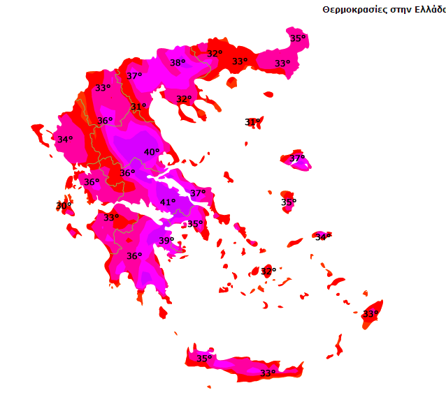 Όμως από αύριο τόσο στην ανατολική Στερεά και Πελοπόννησο όσο και στην Θεσσαλία τα θερμόμετρα θα δείξουν 41 βαθμούς Κελσίου και σε ορισμένες περιοχές θα αγγίξει τους 42.