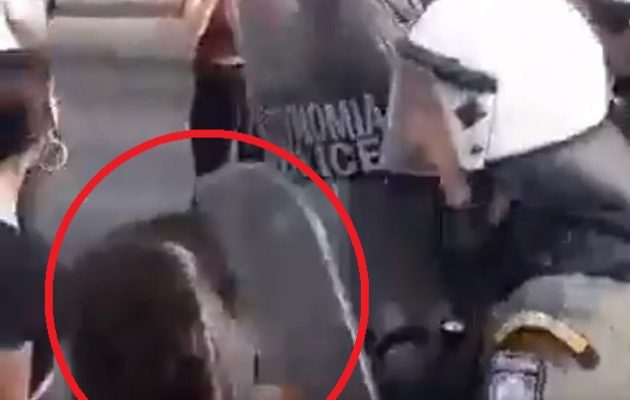 Στο βίντεο, όπως μπορείτε να δείτε, φαίνεται ένας άντρας των ΜΑΤ να σπρώχνει και να κλωτσάει μία νεαρή κοπέλα που διαδήλωνε.