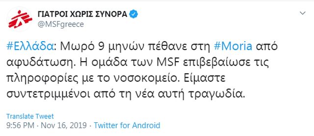 Σύμφωνα με τα όσα αναφέρει η ΜΚΟ «Γιατροί χωρίς Σύνορα», πρόκειται για ένα μωρό προσφύγων στη Μόρια, μόλις 9 μηνών, το οποίο πέθανε από αφυδάτωση.