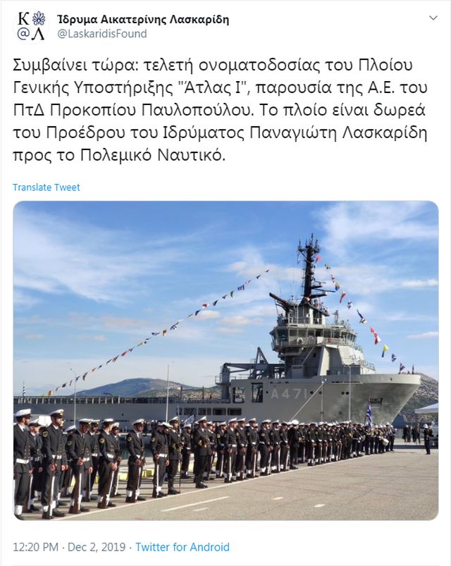 Ο εφοπλιστής Παναγιώτης Λασκαρίδης δώρισε στο Πολεμικό Ναυτικό ένα Πλοίο Γενικής Υποστήριξης ανοικτής θαλάσσης, το «Άτλας Ι».