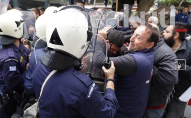 Έξω από το Επιμελητήριο Ηρακλείου όπου ο Μάκης Βορίδης είχε επαφές με τους αγρότες, επικράτησαν στιγμές έντασης και ακολούθησε συμπλοκή των αστυνομικών με τους αγρότες.