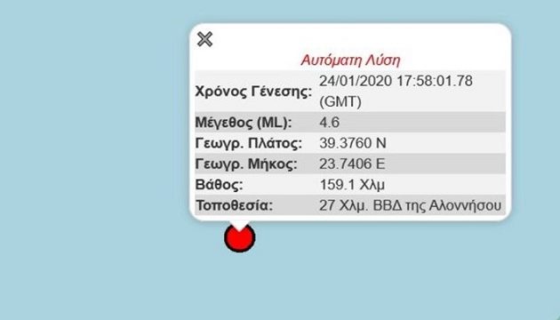 Όπως φαίνεται και στη φωτογραφία από την Αυτόματη Λύση του Γεωδυναμικού Ινστιτούτου το υποτιθέμενο επίκεντρο βρισκόταν 27 χιλιόμετρα βόρεια, βορειοδυτικά από την Αλόννησο και το υποτιθέμενο εστιακό βάθος υπολογιζόταν στα 159,1 χιλιόμετρα.