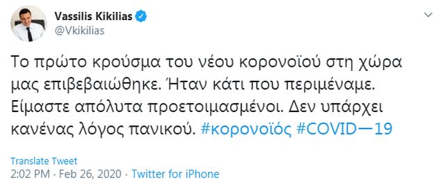 «Το πρώτο κρούσμα του νέου κορονoϊού στη χώρα μας επιβεβαιώθηκε. Ήταν κάτι που περιμέναμε.
