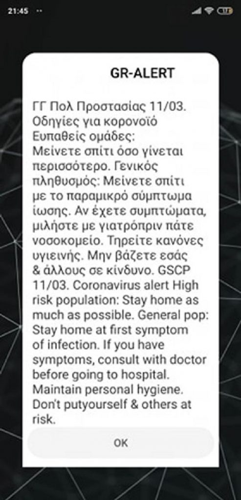 Με μήνυμά της η Γενική Γραμματεία Πολιτικής Προστασίας προς όλους τους πολίτες ενημερώνει το κοινό και κυρίως τις ευπαθείς ομάδες να μείνουν σπίτι όσο γίνεται περισσότερο για να μην εξαπλωθεί ο κοροναϊός.