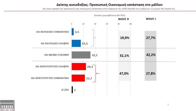 To 32,1% εκτιμά ότι η προσωπική κατάστασή του θα παραμείνει στάσιμη, το 47% ότι θα χειροτερέψει, ενώ το 15,5% ότι θα βελτιωθεί ελαφρά.