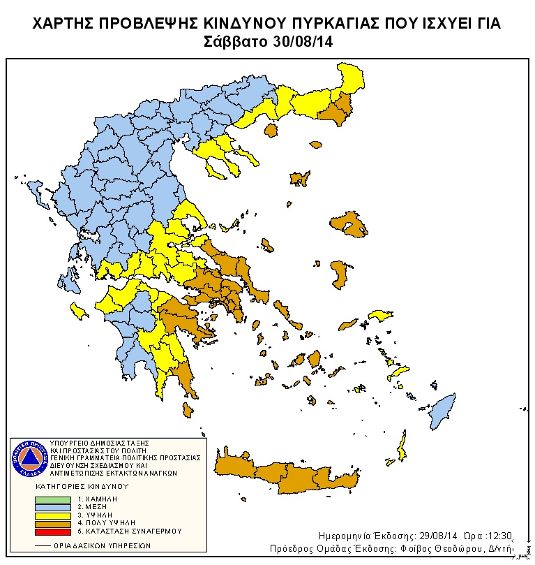 Πολύ υψηλός είναι ο κίνδυνος πυρκαγιάς και για το Σάββατο 30 Αυγούστου σύμφωνα με το Χάρτη Πρόβλεψης Κινδύνου Πυρκαγιάς που εκδίδει η Γενική Γραμματεία Πολιτικής Προστασίας του υπουργείου Δημόσιας Τάξης και Προστασίας του Πολίτη.