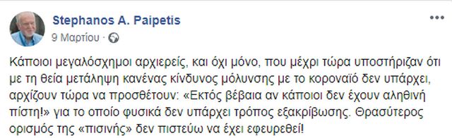 «Κάποιοι μεγαλόσχημοι αρχιερείς, και όχι μόνο, που μέχρι τώρα υποστήριζαν ότι με τη θεία μετάληψη κανένας κίνδυνος μόλυνσης με το κοροναϊό δεν υπάρχει, αρχίζουν τώρα να προσθέτουν: «Εκτός βέβαια αν κάποιοι δεν έχουν αληθινή πίστη!» για το οποίο φυσικά δεν υπάρχει τρόπος εξακρίβωσης. Θρασύτερος ορισμός της «πισινής» δεν πιστεύω να έχει εφευρεθεί!».