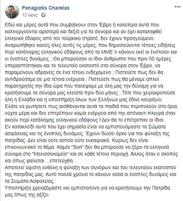 Όπως επισημαίνει, «εδώ και μέρες αυτά που συμβαίνουν στον Έβρο ή καλύτερα αυτά που καλλιεργούνται αριστερά και δεξιά για τα σύνορα και αν έχει καταληφθεί ελληνικό έδαφος από τον τούρκικο στρατό, δεν έχουν προηγούμενο».