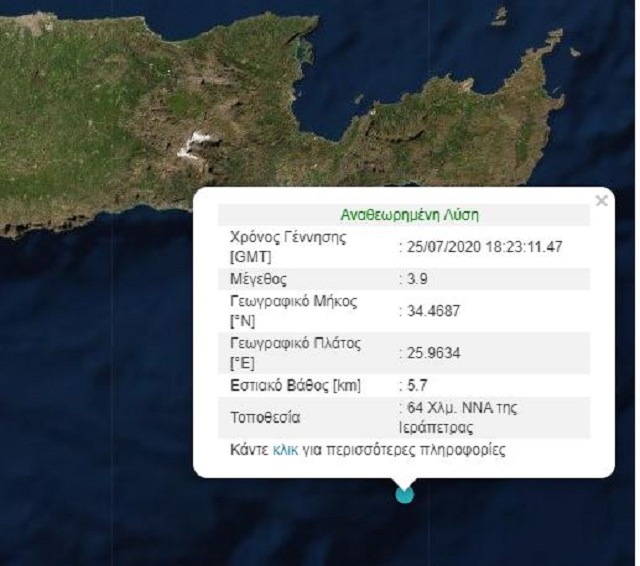 Σύμφωνα με την μέτρηση του Γεωδυναμικού Ινστιτούτο του Εθνικού Αστεροσκοπείου Αθηνών, ο σεισμός σημειώθηκε 64 χλμ. νοτιοανατολικά της Ιεράπετρας και το εστιακό βάθος ήταν 5,7 χλμ.
